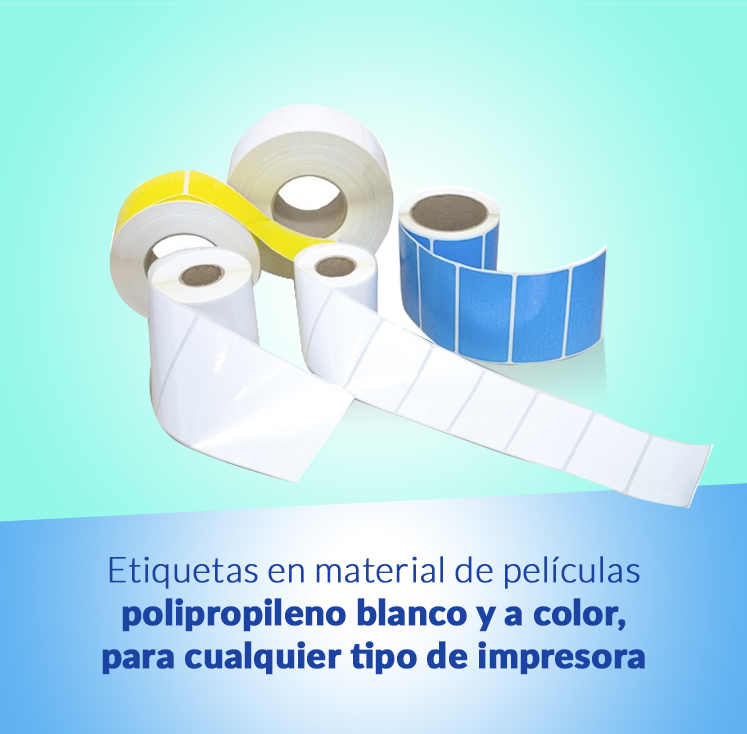POLIPROPILENO: Etiqueta en película ya sea transparente, Blanco O color, el cual es utilizado en la industria donde lo mas importe es el adhesivo y la adherencia de la impresión de alta calidad. Aplicación: Inventario en equipos de cómputo, Envases